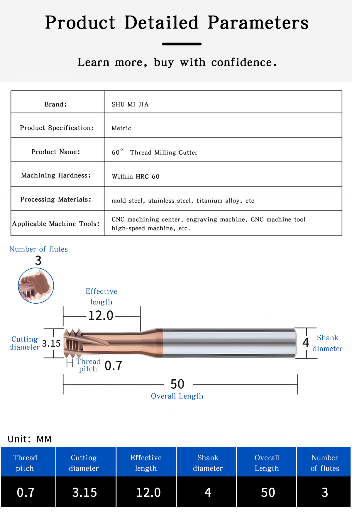 The 3-flute carbide thread mills are engineered for high-precision internal and external threading operations on CNC machines. Designed to machine materials up to HRC65°, these tools provide excellent cutting performance, flexibility, and durability in demanding applications.