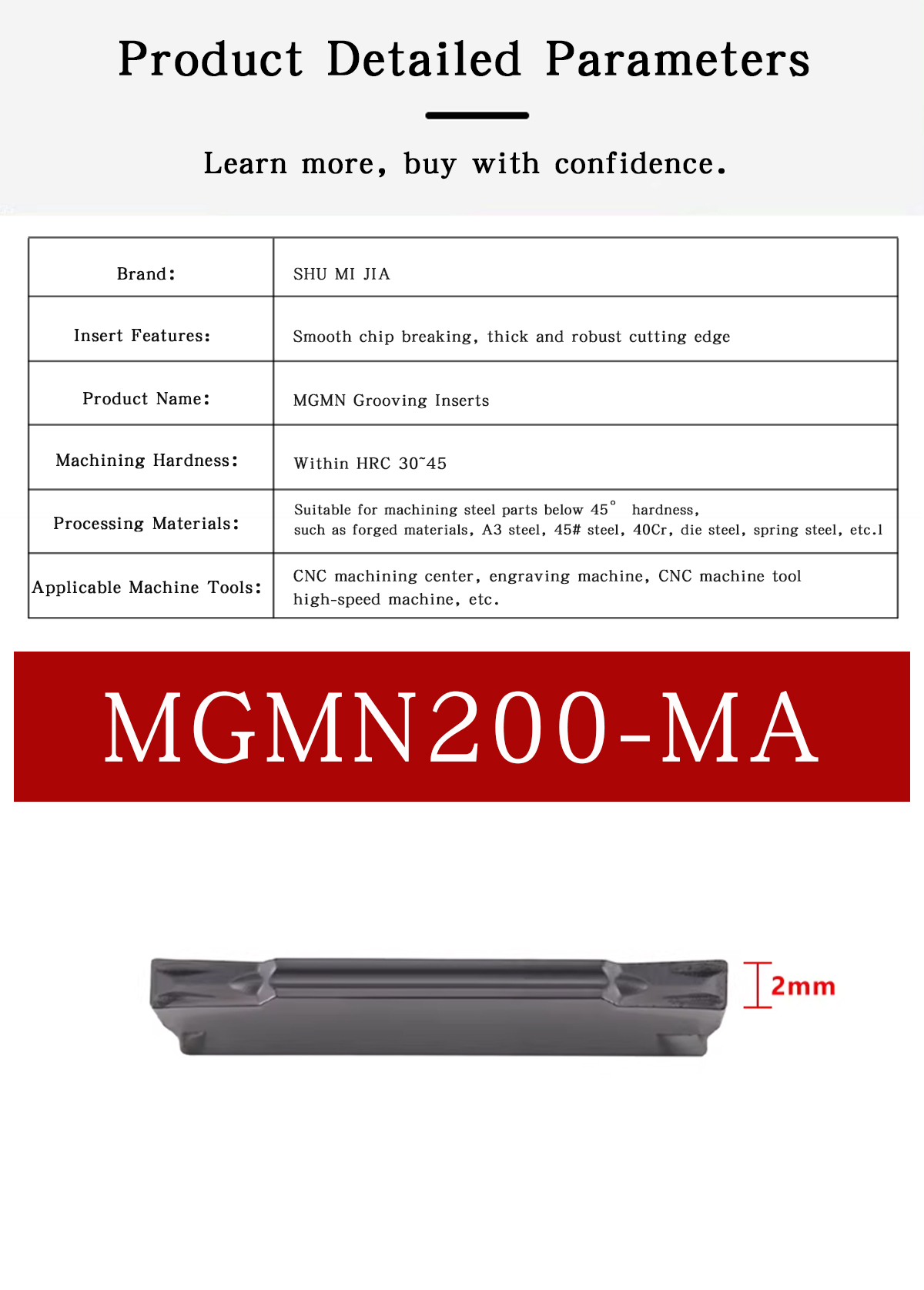 This MGMN200-J carbide insert is a high-performance CNC cutting blade designed for precision parting and grooving operations. Manufactured with advanced SL1025 grade carbide, it offers excellent wear resistance, toughness, and thermal stability across a wide range of materials.