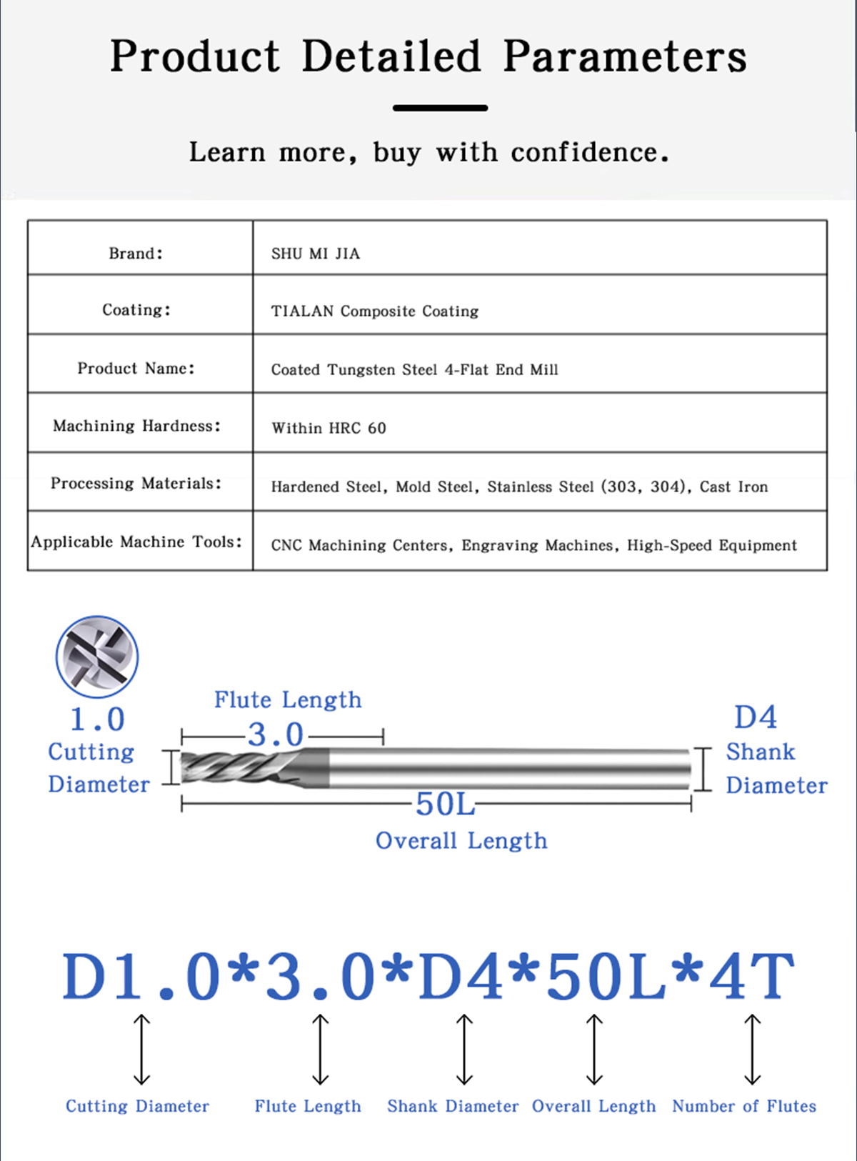 The 4-flute carbide end mills are engineered for high-precision CNC milling of steel and hardened materials. Featuring a premium solid carbide substrate and advanced TiAlN coating, these cutters deliver outstanding wear resistance, heat resistance, and long tool life in demanding machining environments.