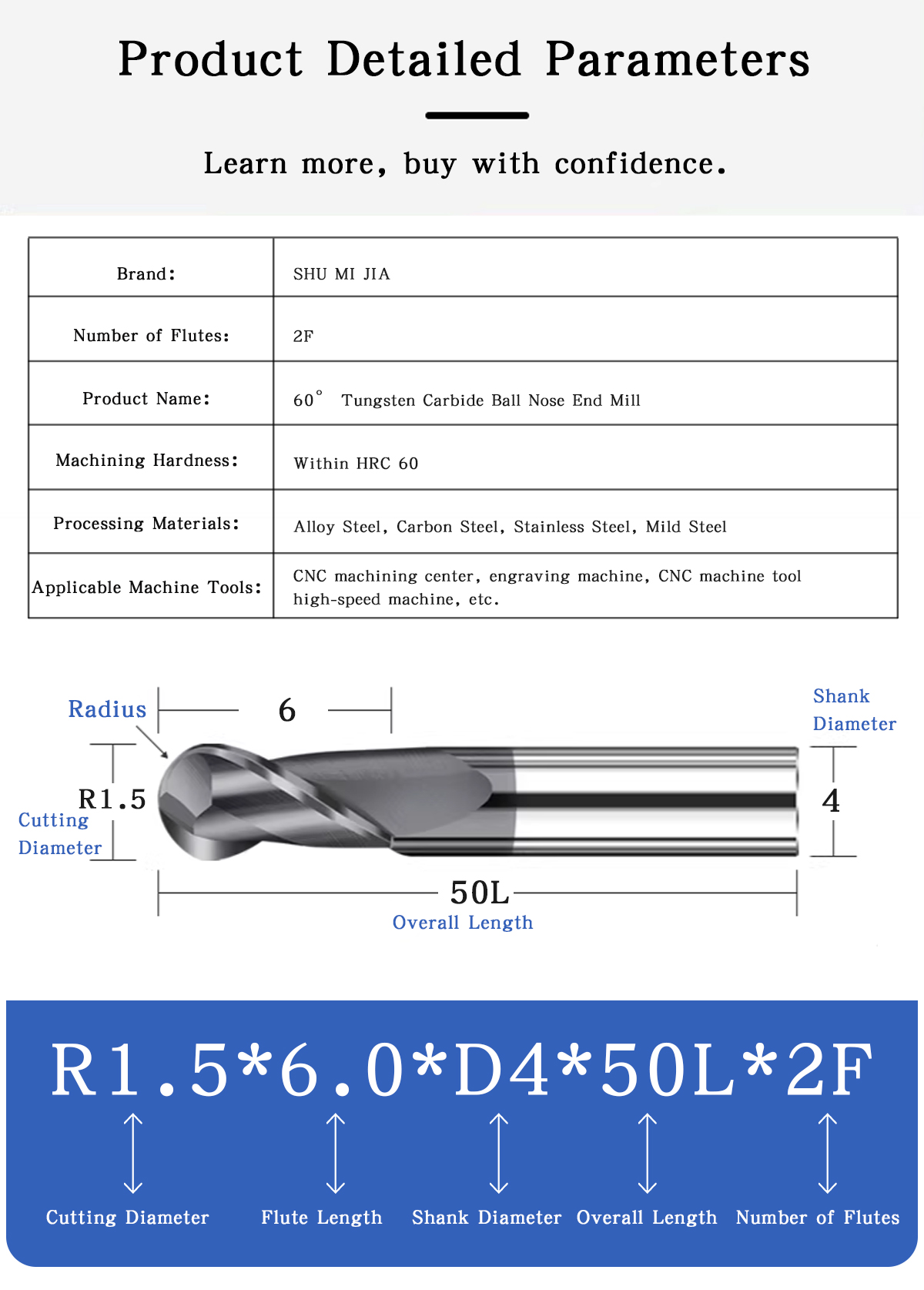 HRC65°2-Flute φ1–φ10mm TiAlN Coated Carbide Ball Nose End Mills for CNC Milling